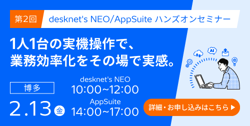 業種規模問わず幅広くお客さまにご利用いただいているグループウェアdesknet’s NEO。本セミナーでは、その豊富な機能を1人1台のPCで実際に操作しながら体験いただけます。